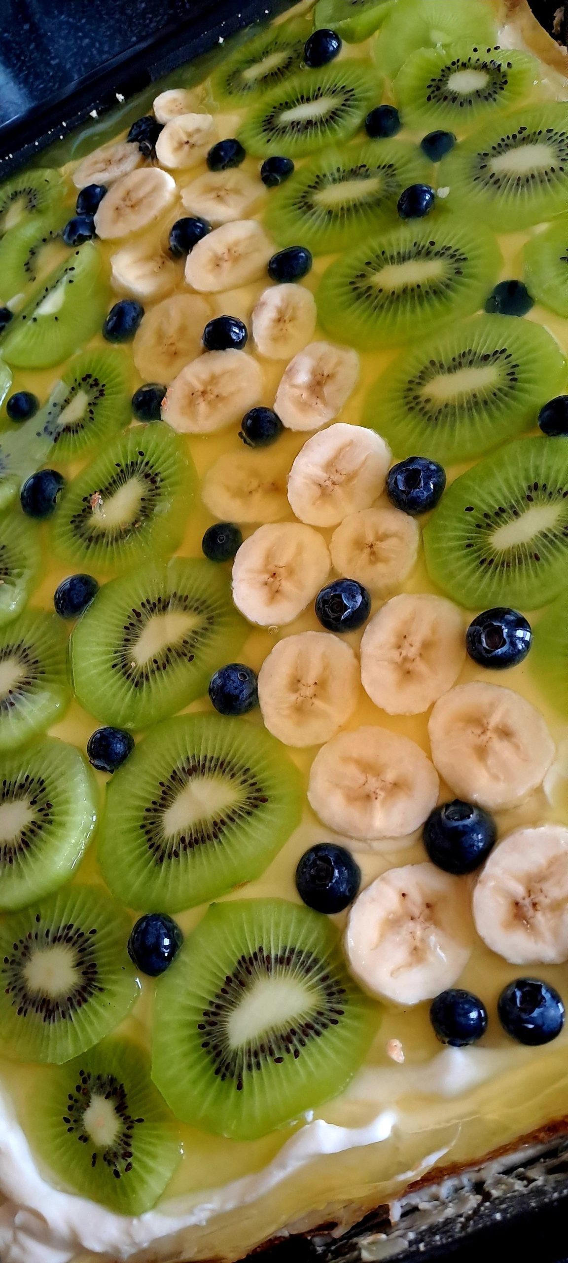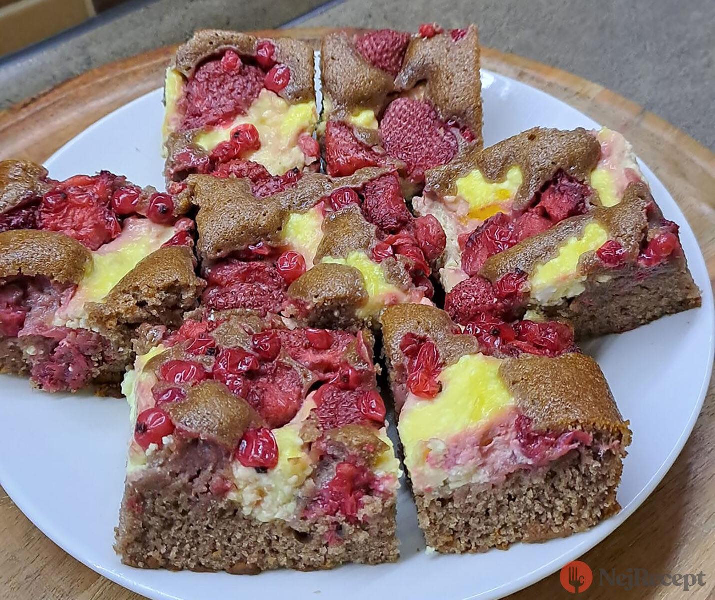 Hrnkový koláč s tvarohem, jahodami a rybízem