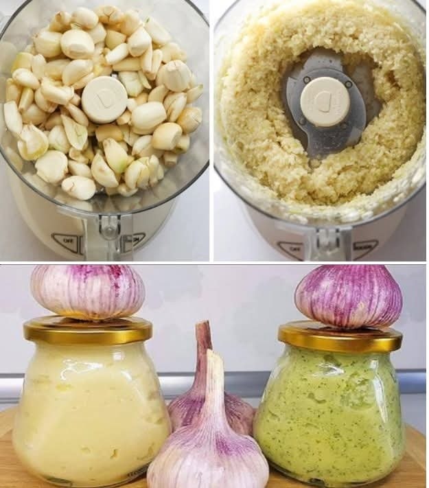 Připravte si také sterilizovanou sklenici o objemu 300 mililitrů nebo několik menších skleniček. Všechen česnek oloupejte a rozmixujte v mixéru na kaši.