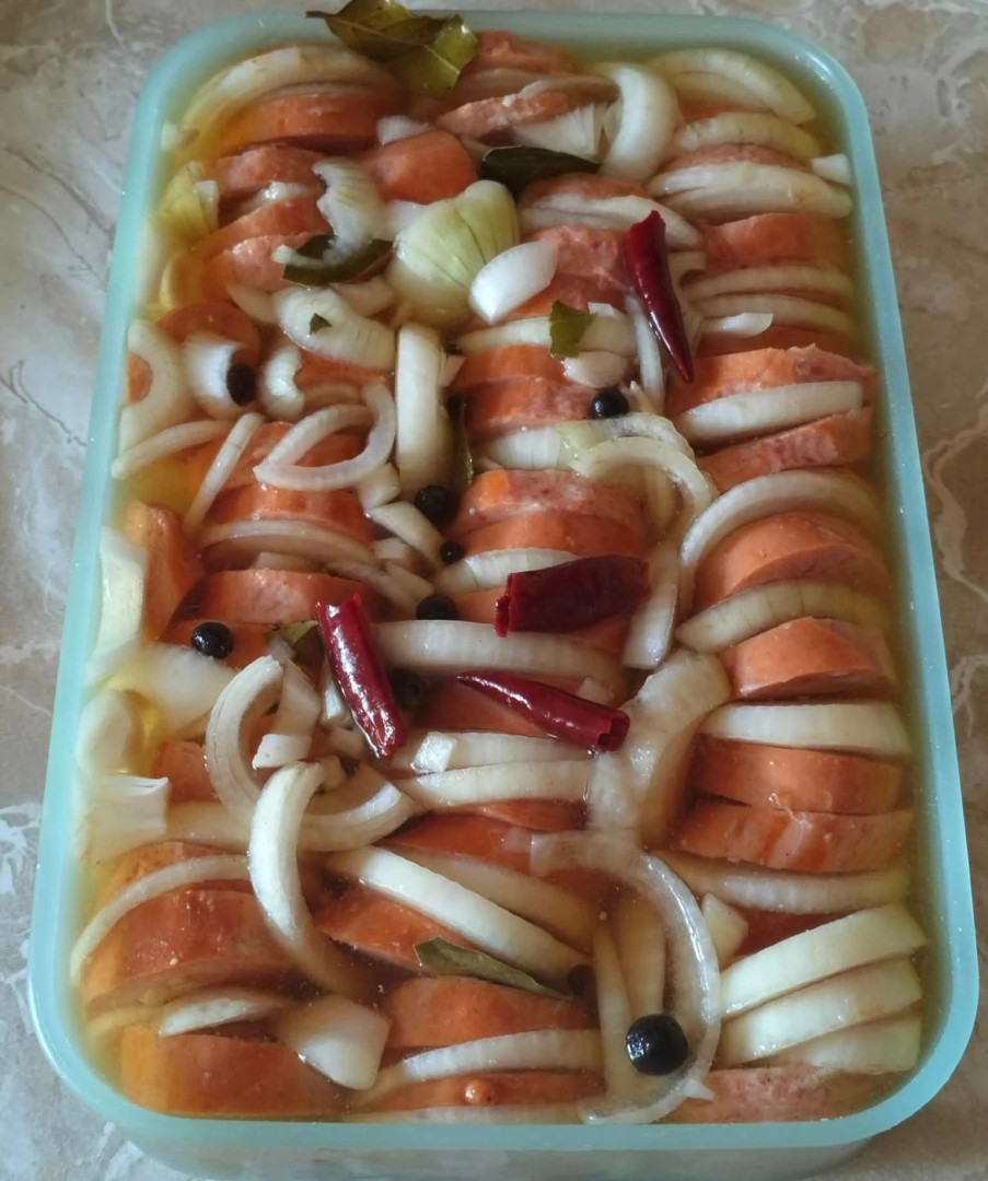 Poctivá hospodská klasika do sklenice. Špekáčky naříznuté „na knihu“, potřené hořčicí, proložené cibulí a zalité horkým pivním nálevem se sladkokyselým kořením. Recept je rychlý na přípravu, pak už stačí jen trpělivost při zrání.