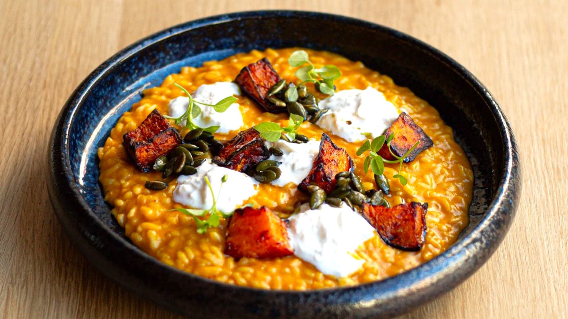 Dýňové risotto je klasický podzimní pokrm, který s oblibou vaříme doma, ale slaví úspěch i v restauracích. Inspirujte se verzí, kterou připravil šéfkuchař Radek David pro vinný bar Vinograf. Krémovost mu dodá nejen pyré z pečené dýně, ale také lahodný sýr stracciatella, o křupavý akcent se postarají dýňová semínka. Ideální pokrm ke sklence výrazného ryzlinku.
