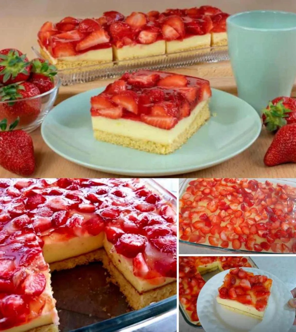 Tento svěží letní dezert spojuje nadýchaný piškotový korpus, jemný vanilkový pudink obohacený zakysanou smetanou a vrstvu šťavnatých jahod zalitou lesklou glazurou. Díky jednoduché přípravě a osvěžující chuti je ideální pro rodinné oslavy, posezení s přáteli či jako sladká tečka k odpolední kávě.