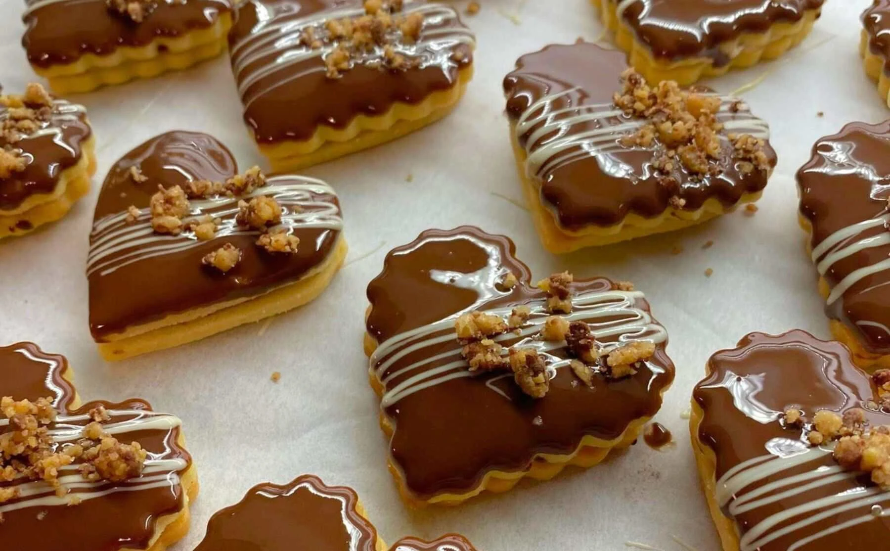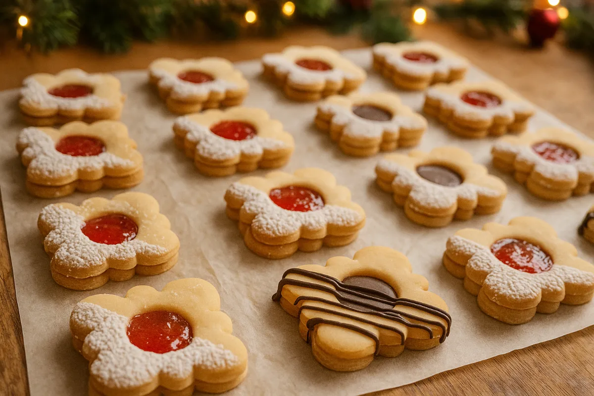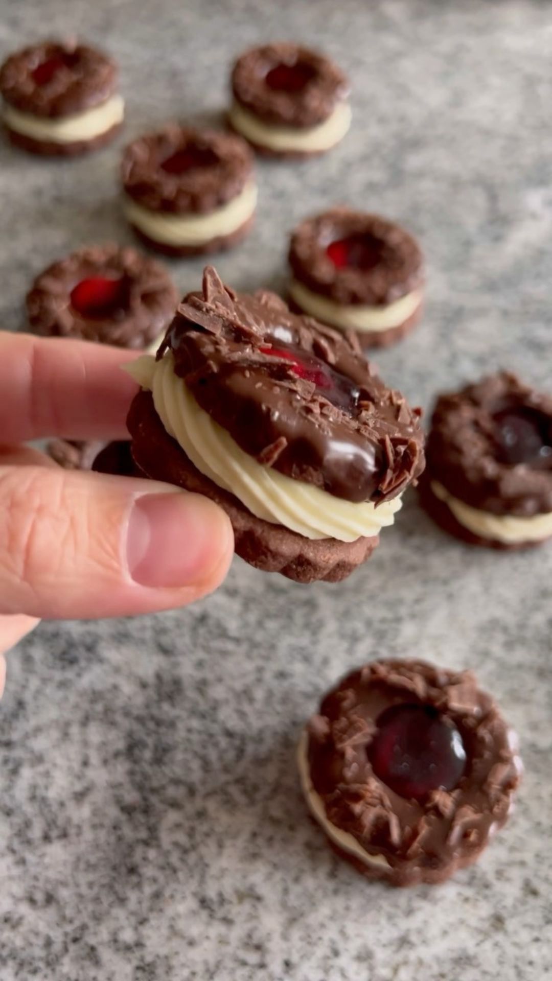 Ingredience Těsto: 340 g hladké mouky 200 g másla (měkkého) 100 g moučkového cukru 1 vejce 1 lžíce kakaa 1 lžička vanilkového extraktu Ganache = čokoládový krém z bíle čokolády: 200 g bílé čokolády 100 ml smetany ke šlehání (33–35 %) Další: višňový džem (ideálně hladký) čokoládová poleva nebo hoblinky čokolády na ozdobu