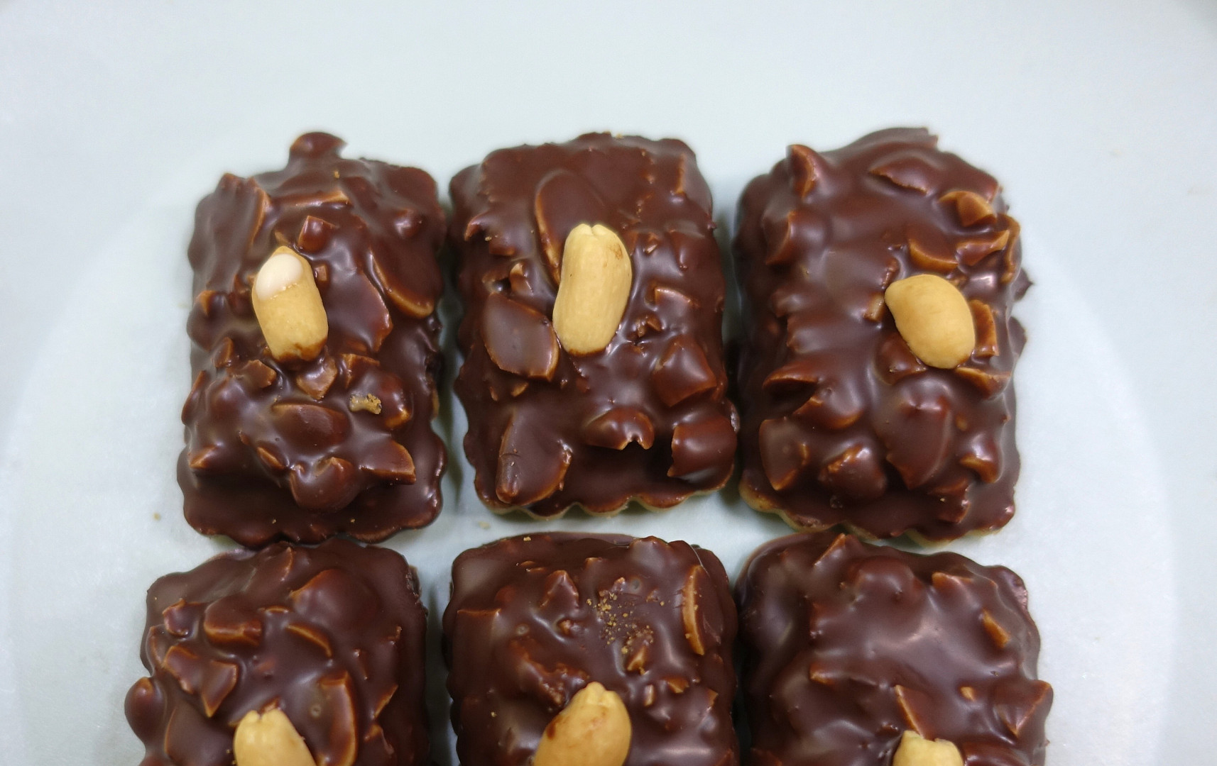 Těsto: 300 g hladké mouky 100 g moučkového cukru 180 g másla 1 žloutek 1 sáček vanilkového cukru 50 g jemně nastrouhaných nesolených arašídů 1/4 lžičky mleté skořice Dále: 100 g hořké čokolády ztužený tuk (dle potřeby) 200 g loupaných pražených nesolených arašídů 300-400 g arašídové pomazánky