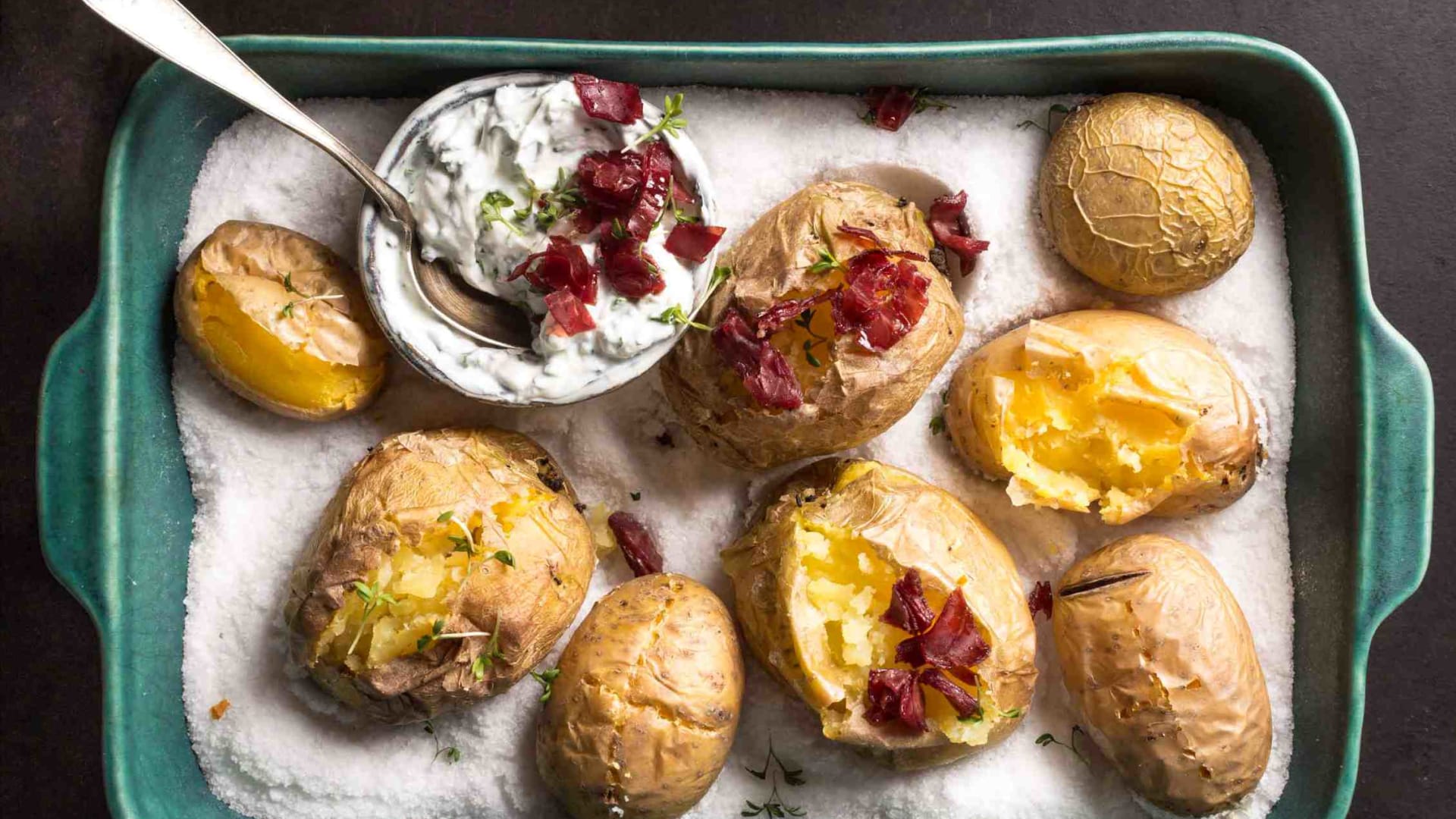 Pečení v soli je oblíbený způsob přípravy – můžete tak péct například kuře nebo celé ryby. Pokud se pustíte do pečení brambor v soli, zjistíte, jak výbornou mají chuť a také strukturu. Doplňte je svěžím tvarohovým dipem s bylinkami.