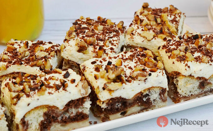 Tento zákusek možná znáte, ale v jiné, pozměnené kombinaci. Manžel ohodnotil, že je vynikající a už dávno jsem takový dobrý zákusek nenapekla. Je lahodný, ne příliš přeslazený a studený z chladničky chutná nejlépe.